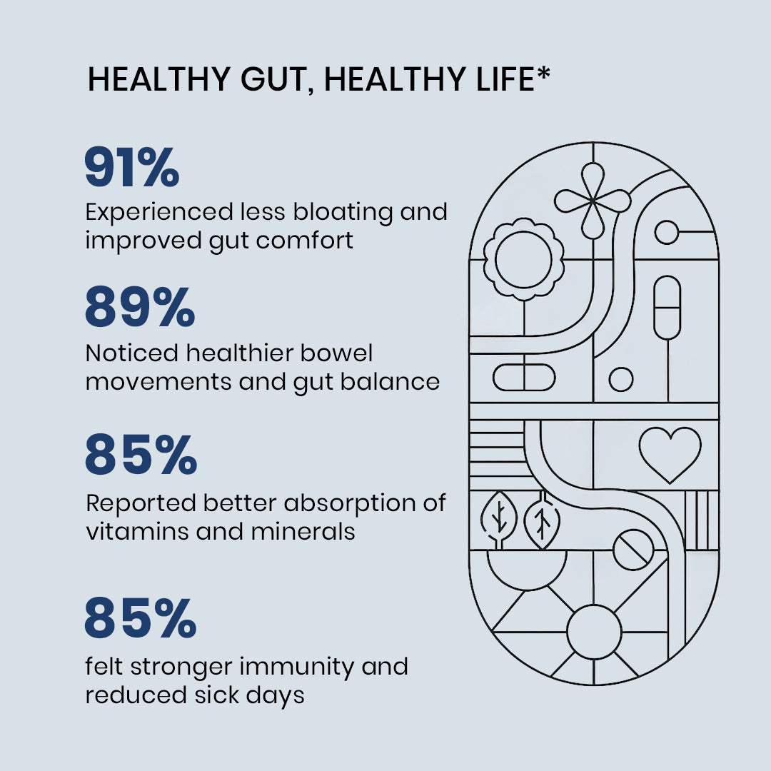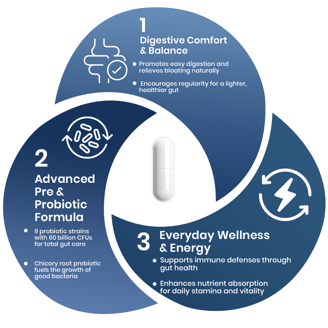 It helps restore gut balance, improve digestion, reduce bloating, and strengthen immunity with a powerful blend of probiotics and prebiotics.